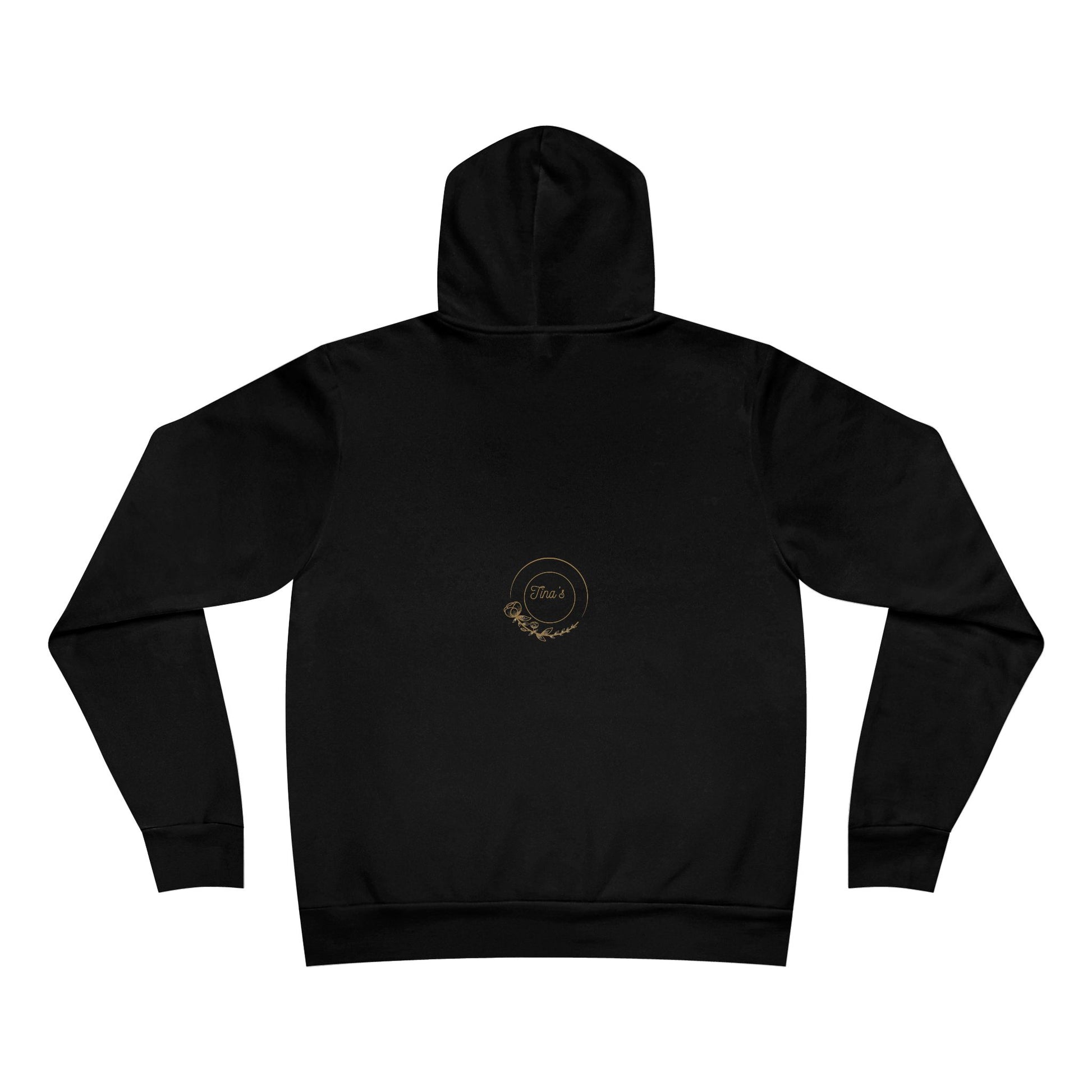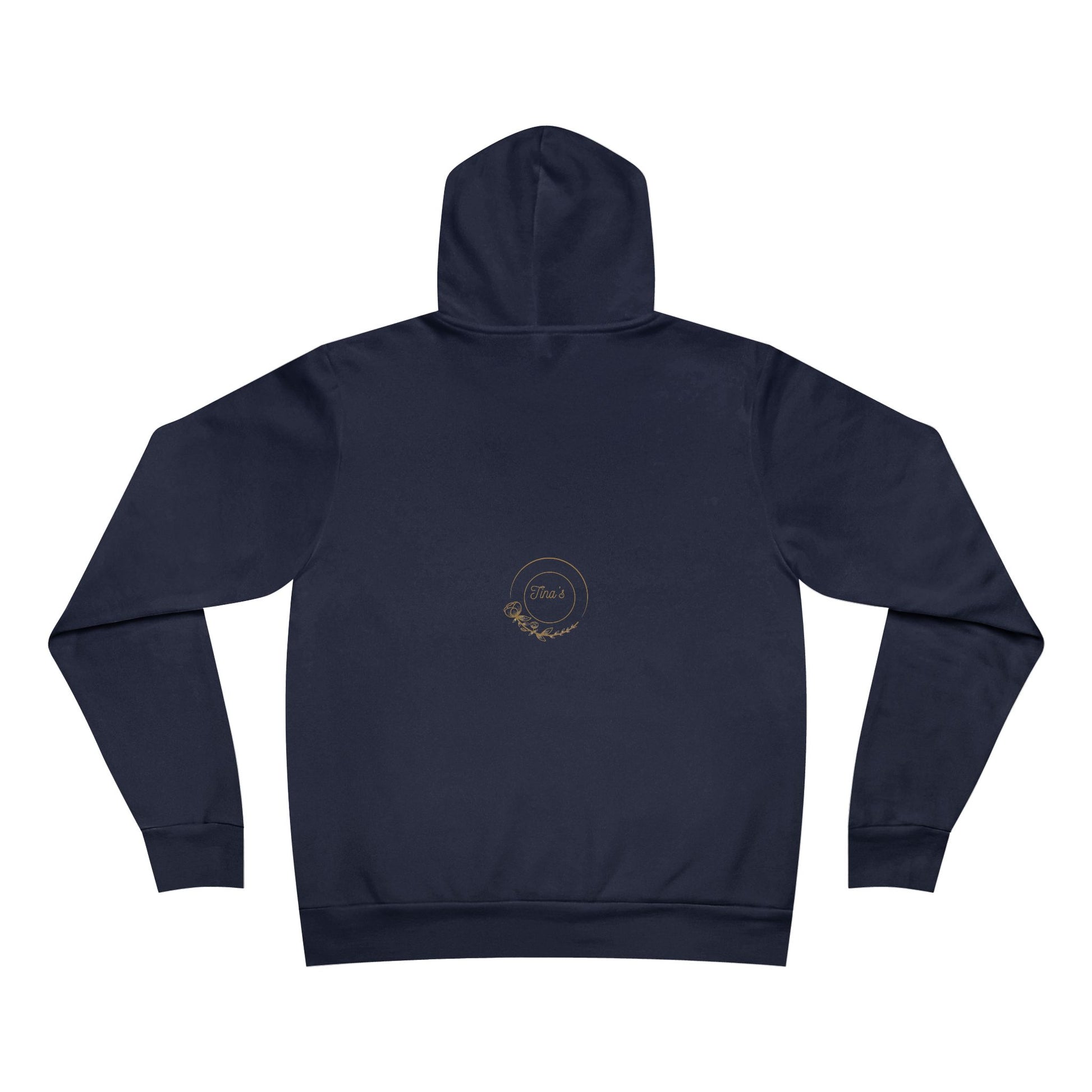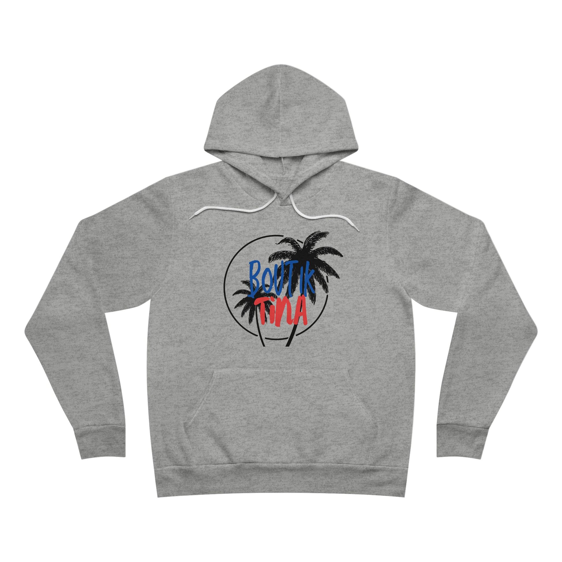 The unisex sponge fleece pullover hoodie is a blend of Airlume cotton and polyester. The percentages vary according to color. A pouch-style pocket spreads across the lower half of the garment’s front. The hood can be tightened with a white drawcord. Both cuffs and waistband have ribbing for extra grip.
